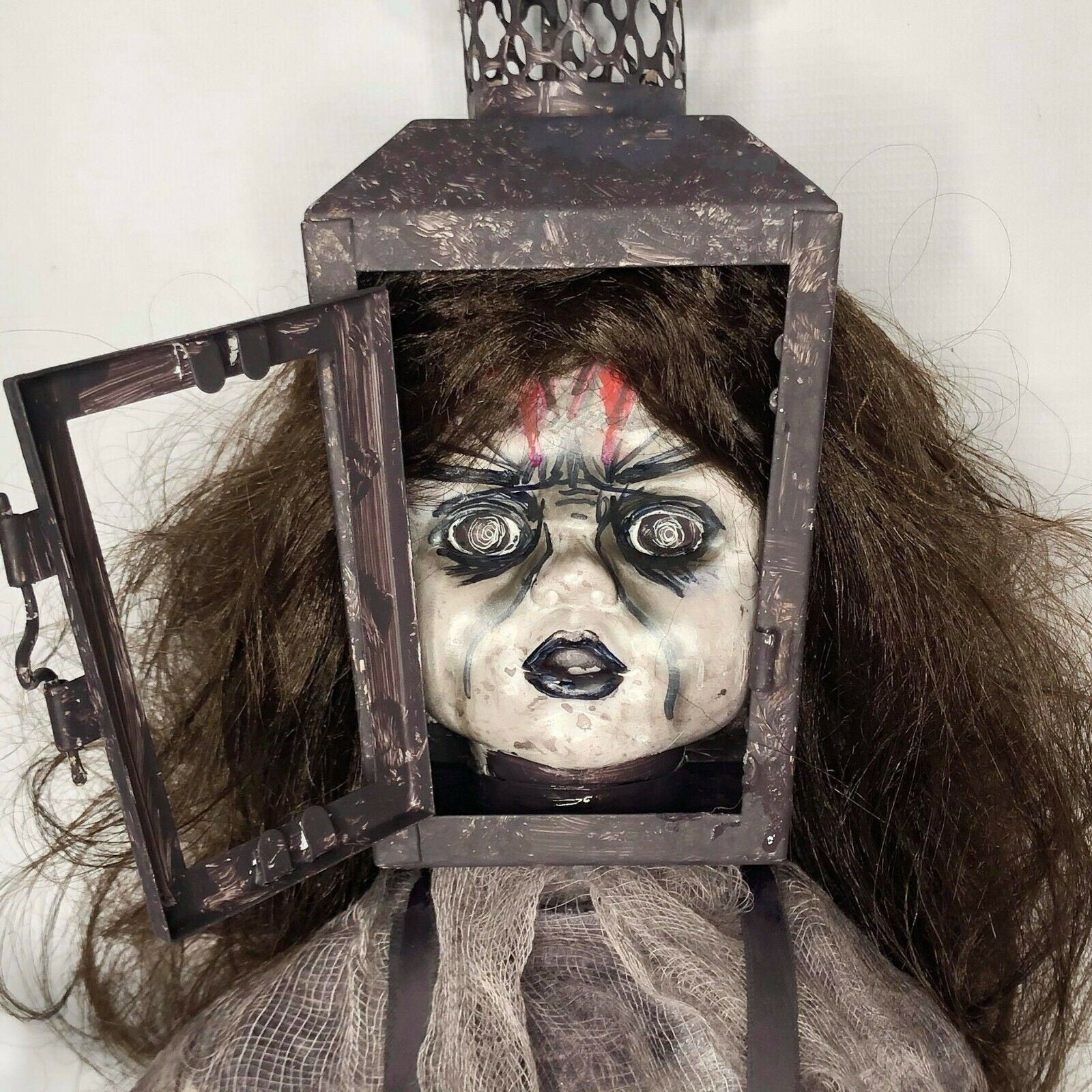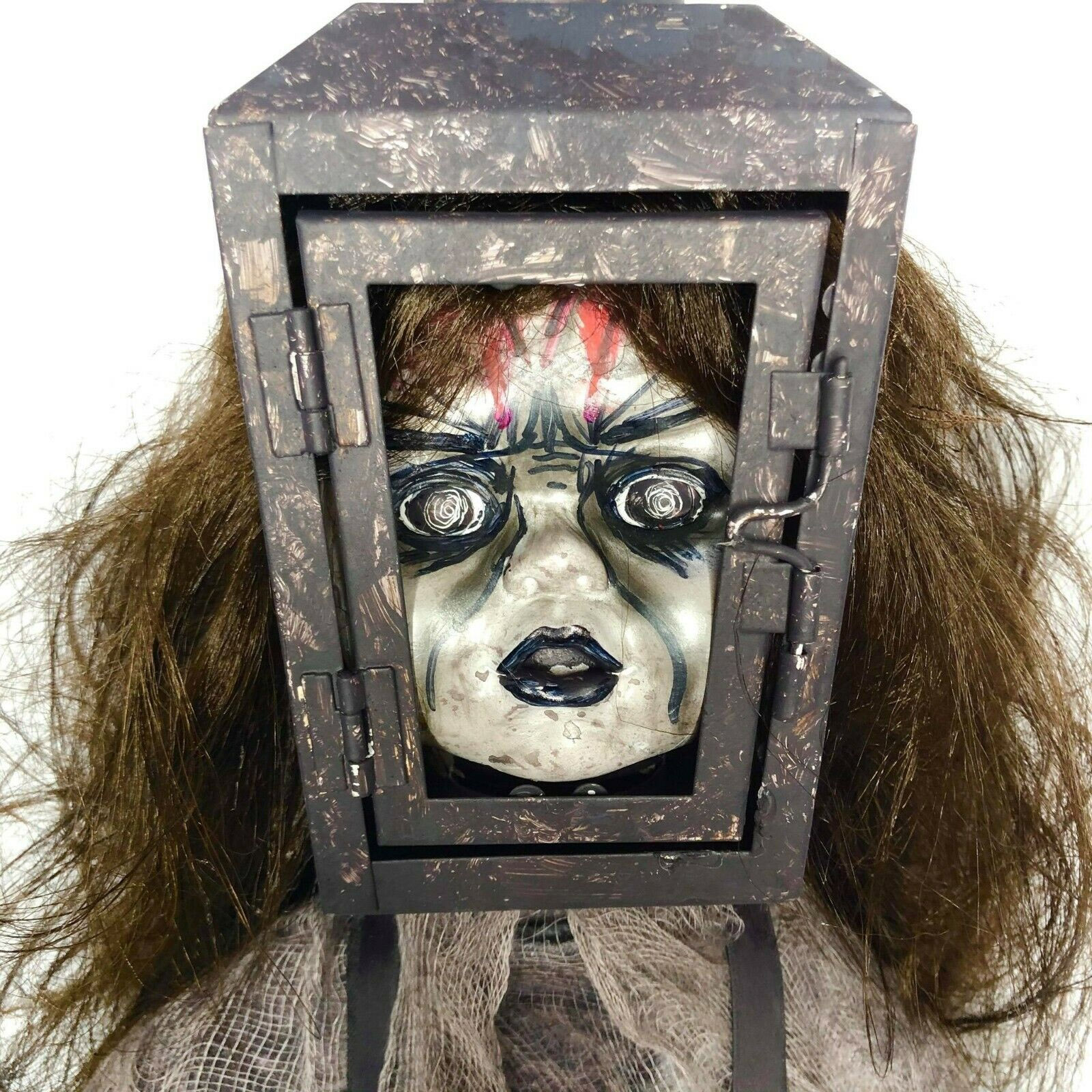 Inspired by The Jackal in the supernatural horror film Thir13en Ghosts. The Jackal is the 11th ghost and is incredibly frightening with his head locked in a cage, torn straitjacket and hatred of humanity. This Jackal Doll is intended for collection and display only. Not intended for children. Clothes cannot be removed and only light dusting of doll is recommended. This doll is handmade with recycled items and they may contain imperfections. Tagged, numbered, signed with date of rebirth.