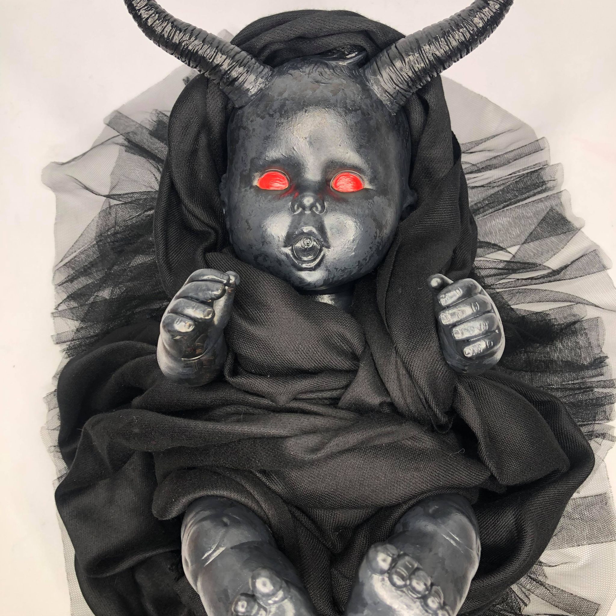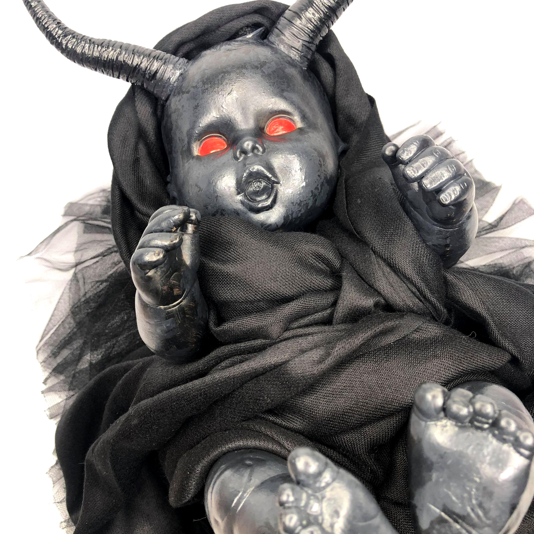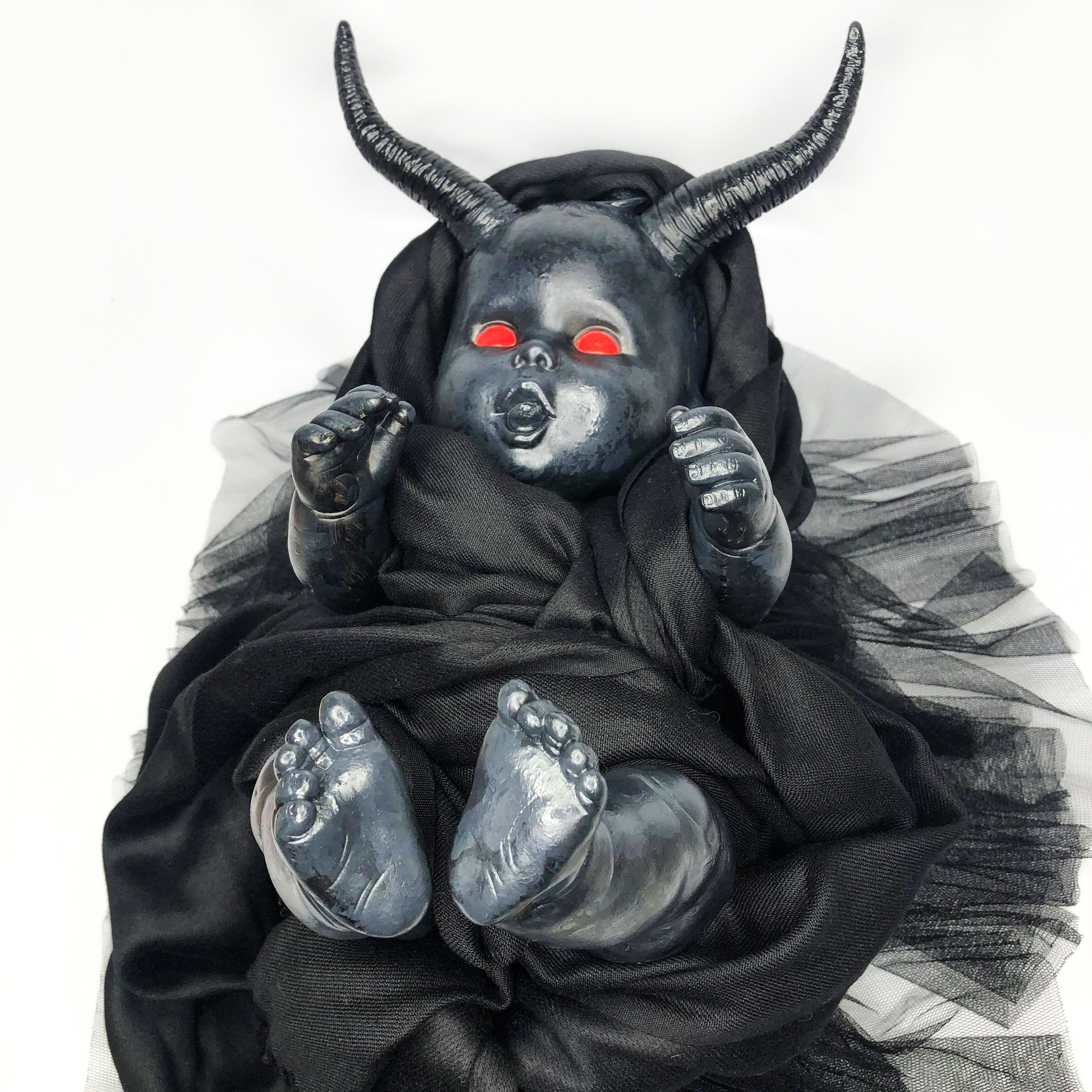 Inspired by Roman Polanski's "Rosemary's Baby" Horror Novel Movie Character Doll OOAK Numbered & Signed. Swaddled demon doll in tulle lined cradle. Doll can be removed and cradled in arms. This doll measures approximately 20" Long x 14" Wide x 12" High. This custom doll is intended for collection and display only. Not intended for children. Vinyl doll is handmade with recycled items and they may contain imperfections. Original Design by Erika Schulte. Carefully Packaged. Shipped via UPS ground with tracking and insurance.