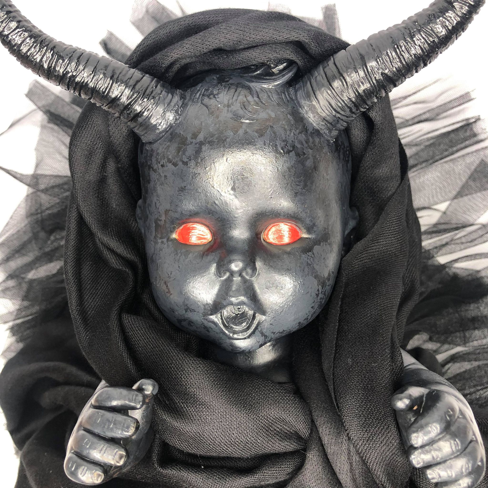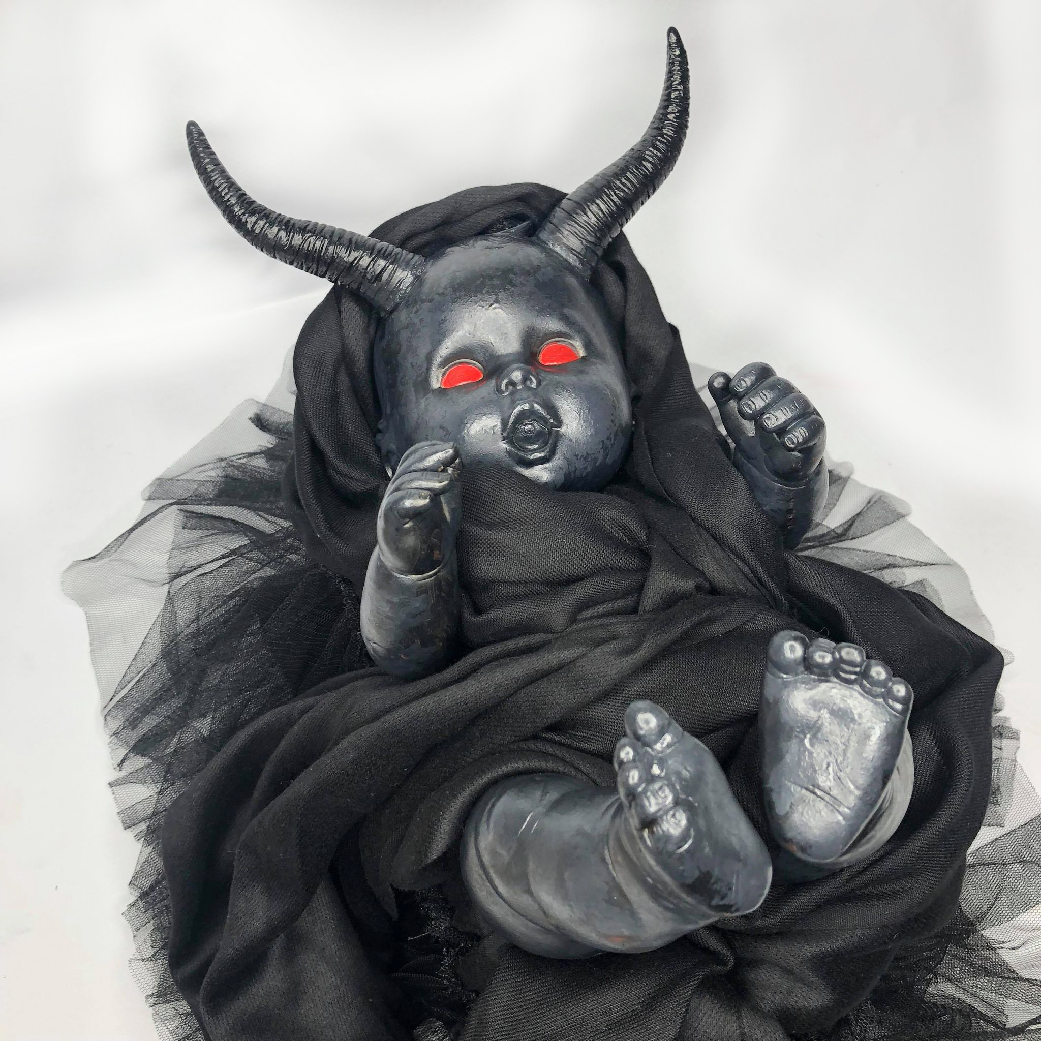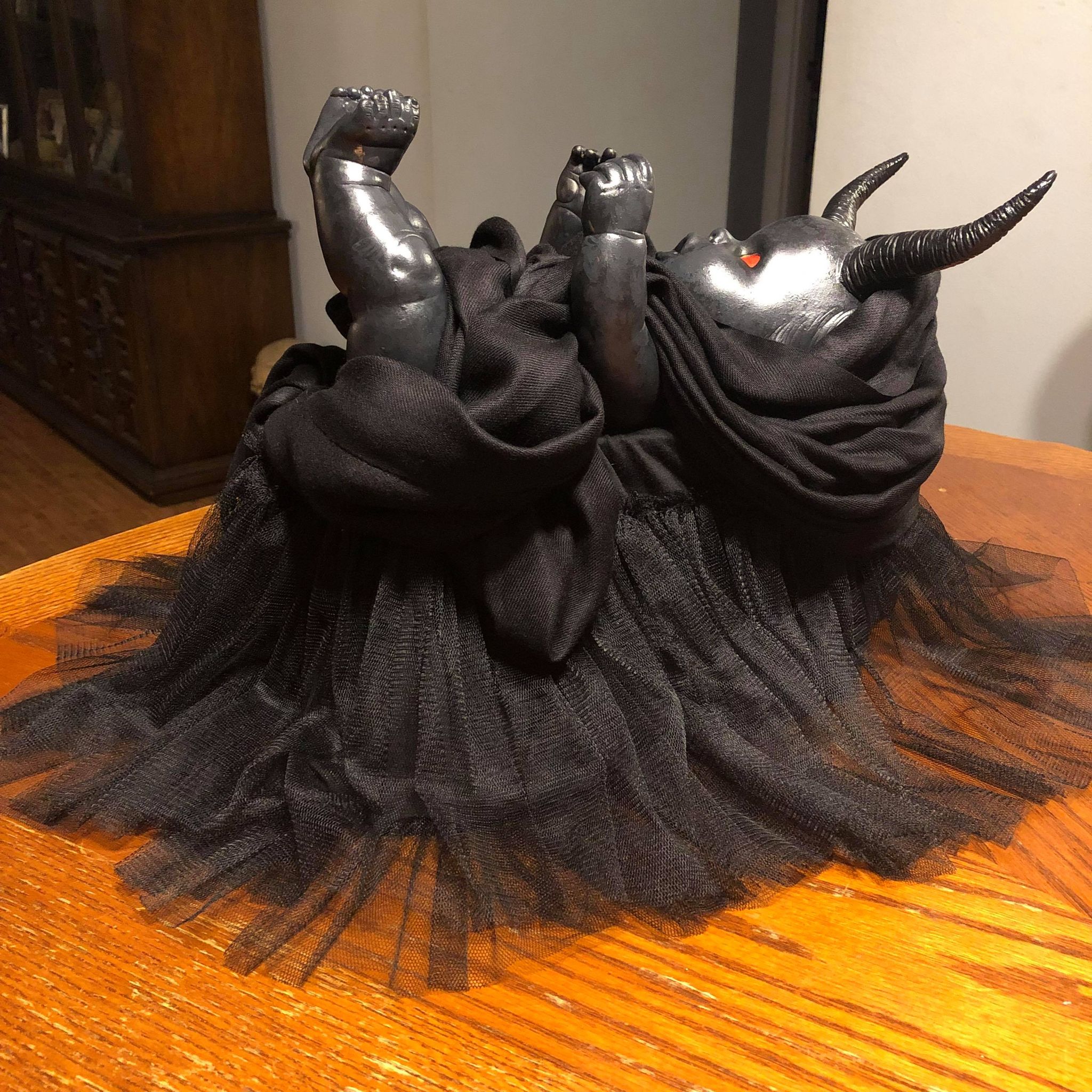 Inspired by Roman Polanski's "Rosemary's Baby" Horror Novel Movie Character Doll OOAK Numbered & Signed. Swaddled demon doll in tulle lined cradle. Doll can be removed and cradled in arms. This doll measures approximately 20" Long x 14" Wide x 12" High. This custom doll is intended for collection and display only. Not intended for children. Vinyl doll is handmade with recycled items and they may contain imperfections. Original Design by Erika Schulte. Carefully Packaged. Shipped via UPS ground with tracking and insurance.