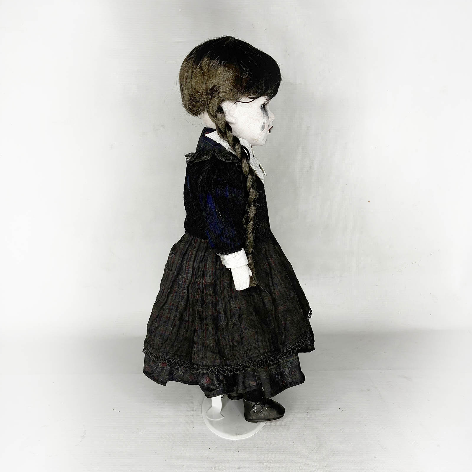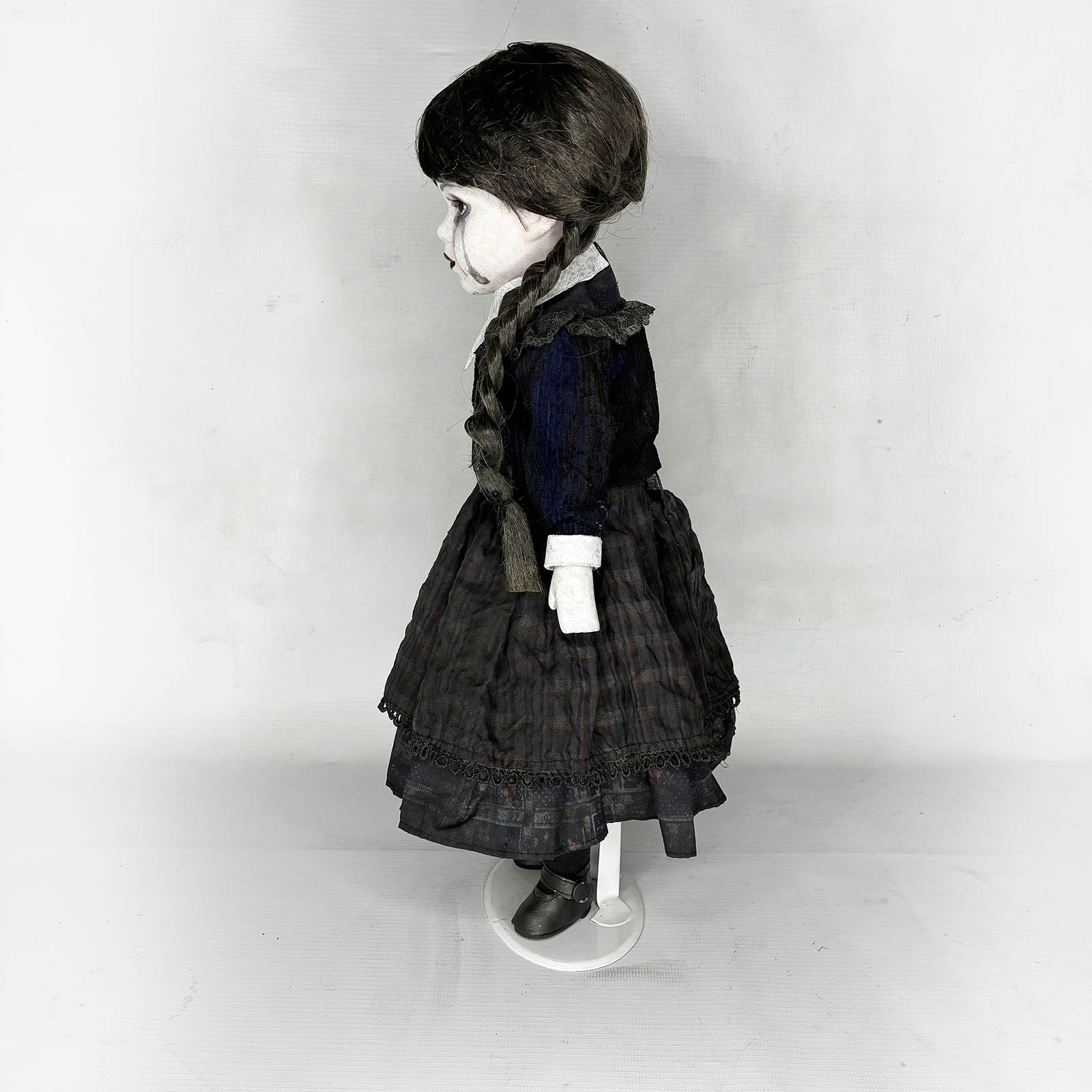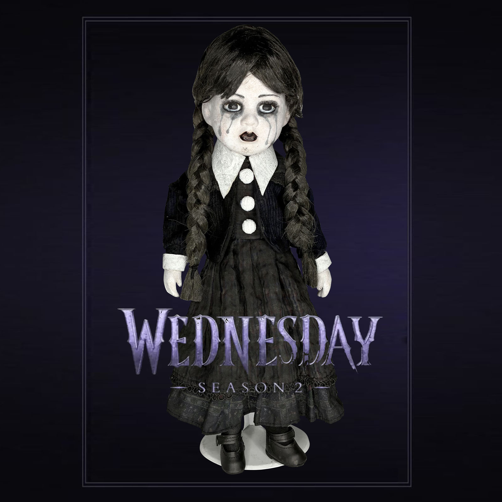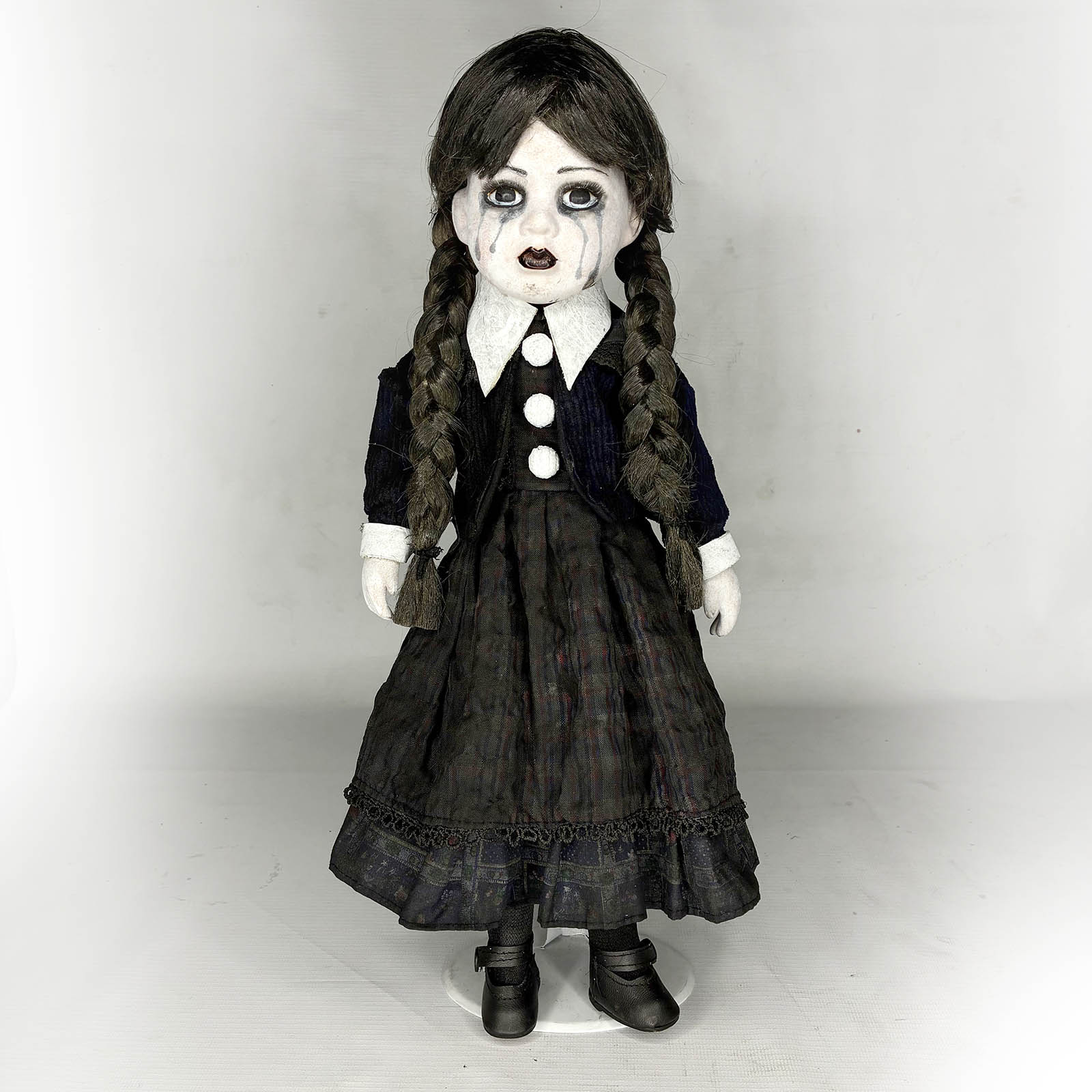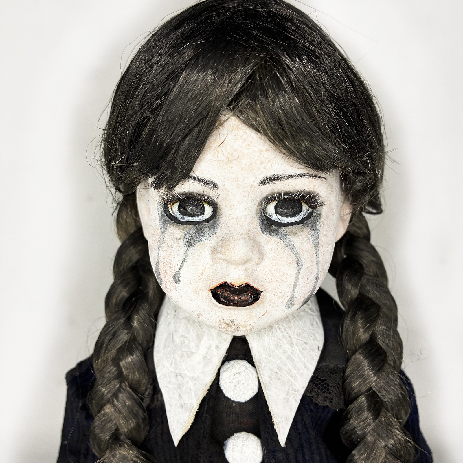 Inspired by Season 2 of Wednesday, this one-of-a-kind (OOAK) 16" porcelain doll is handmade, numbered (#31), and signed by the artist at Erika's Emporium. Crafted with gothic elegance, she features haunting black tears just like the new season, making her a striking and emotional display piece. A true collector's oddity for fans of horror, dark art, and the Addams legacy. Beautifully eerie and entirely unique — only one exists. A must-have for gothic collections.