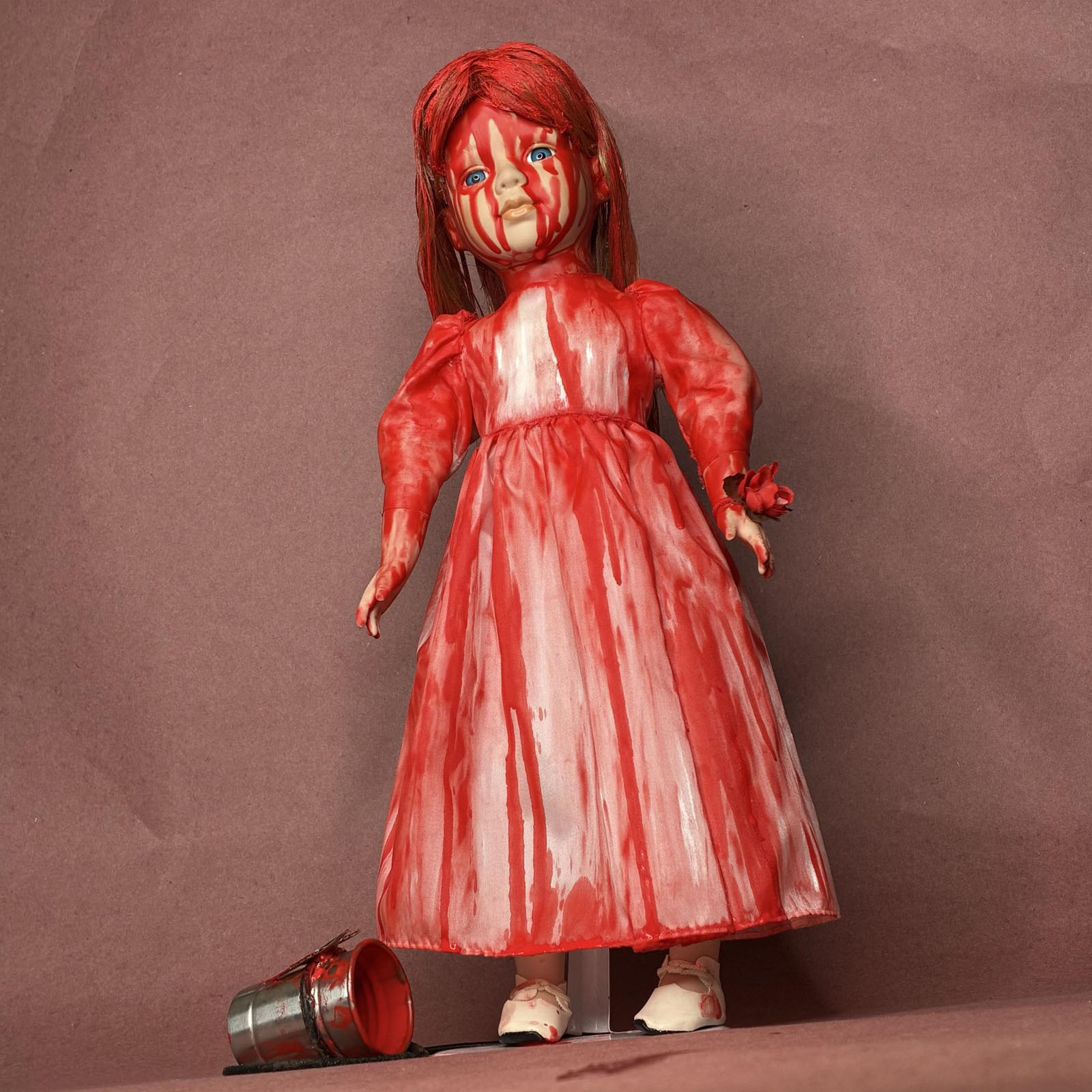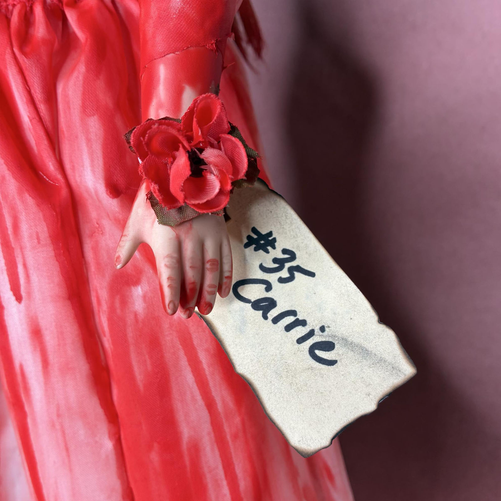 Meet Carrie White, the tragic prom queen from Stephen King's Carrie, reborn as a haunting collectible from Erika's Emporium. This handmade 16.5-inch art doll, numbered #35, captures her fragile beauty and quiet fury with eerie, one-of-a-kind detail.