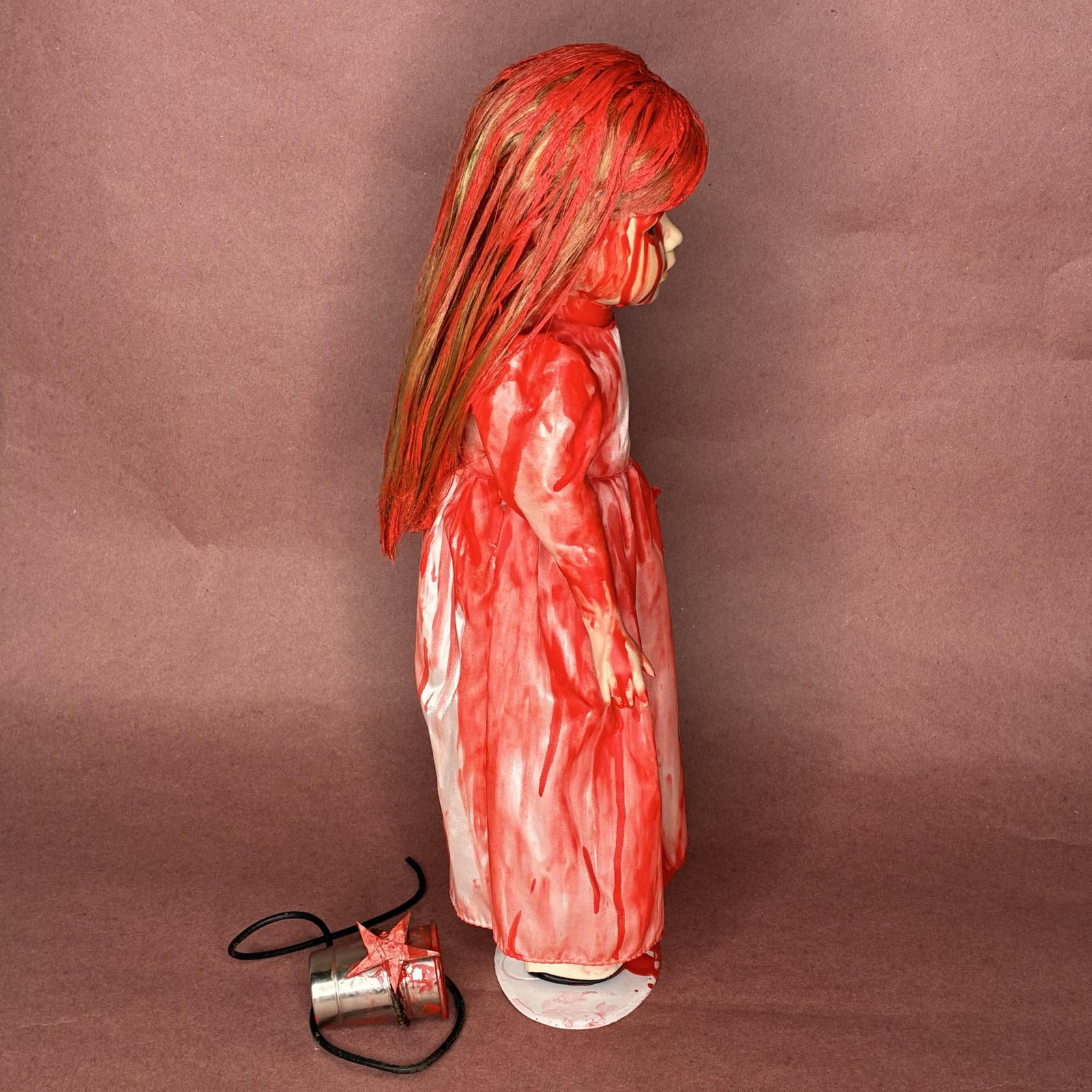 Each doll from Erika's Emporium is crafted from recycled materials, uniquely signed and tagged, ensuring no two are ever the same. Carrie White #35 is a dark art creation meant for display not play.
