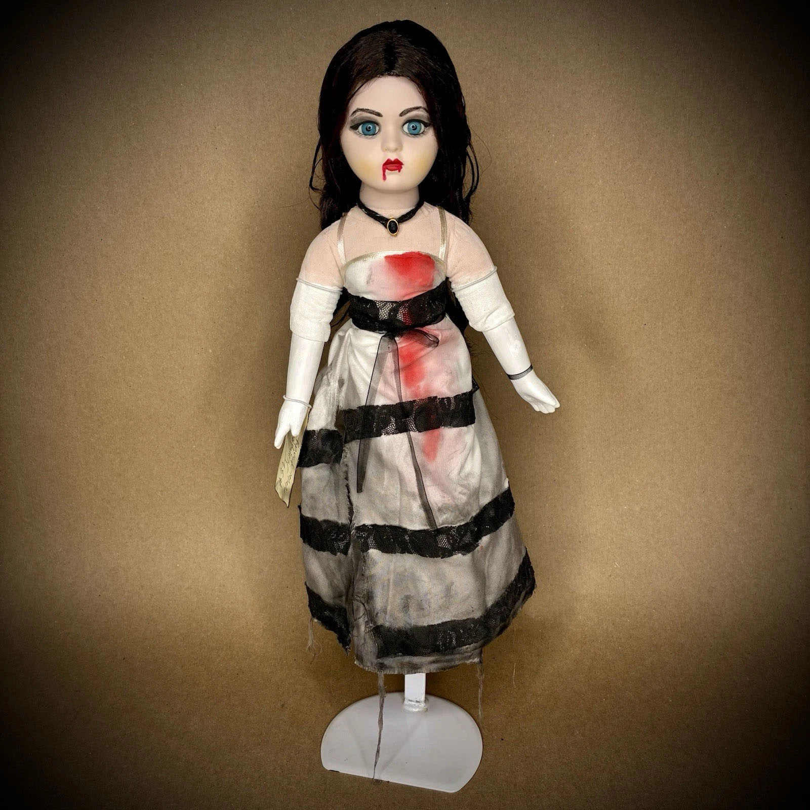Introducing Jennifer's Body #37 handmade horror doll by Erika's Emporium. Inspired by the cult classic film. This one-of-a-kind piece captures Jennifer in her eerie, post-possession glory, dressed in her iconic homecoming dance dress, levitating just above the surface.