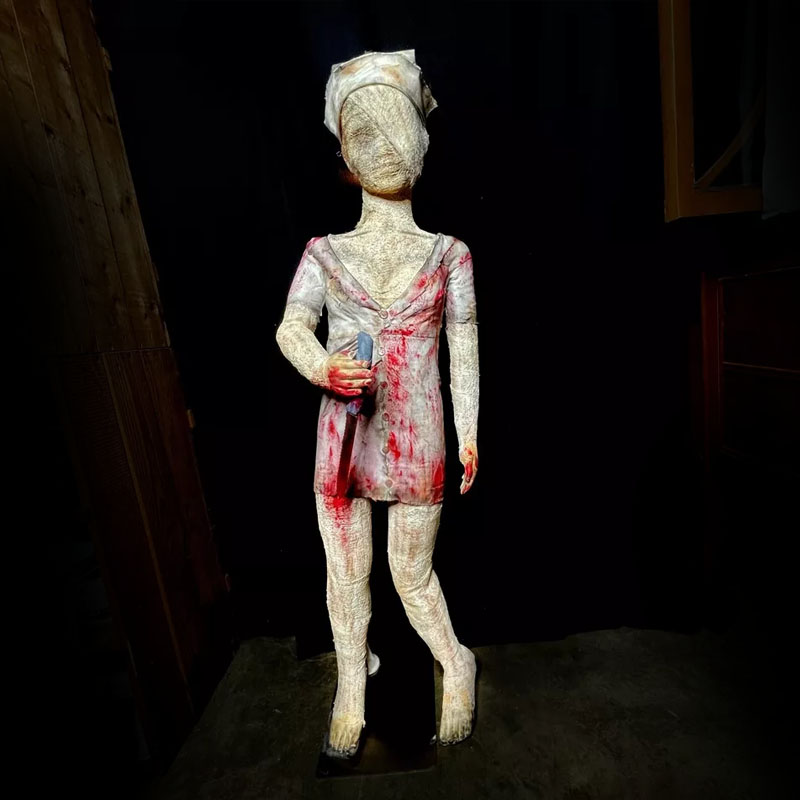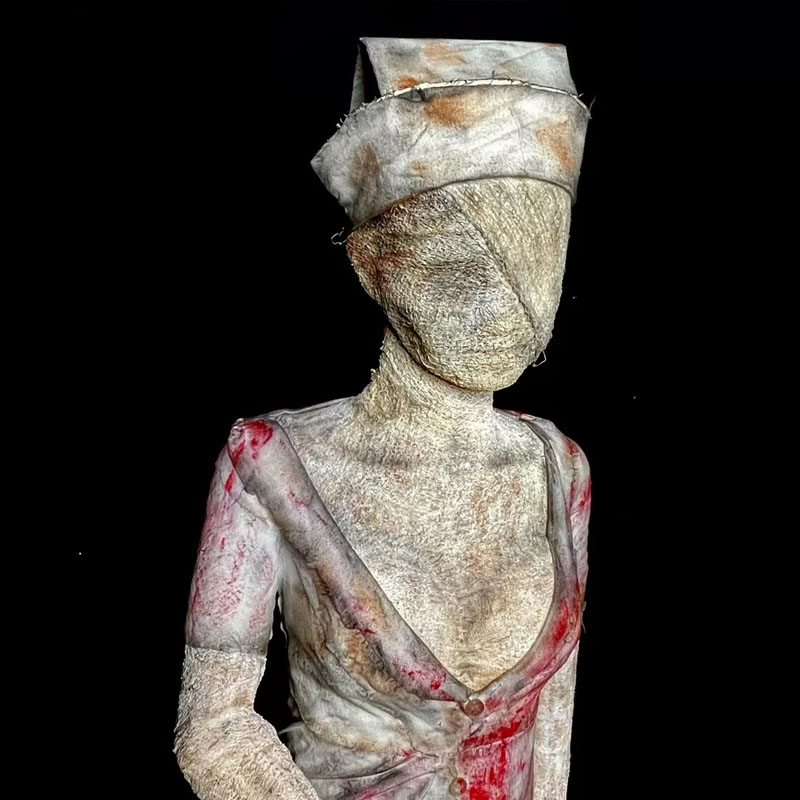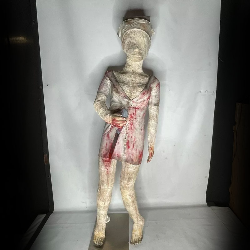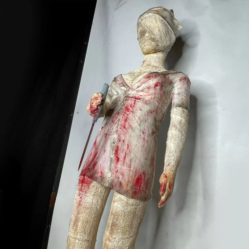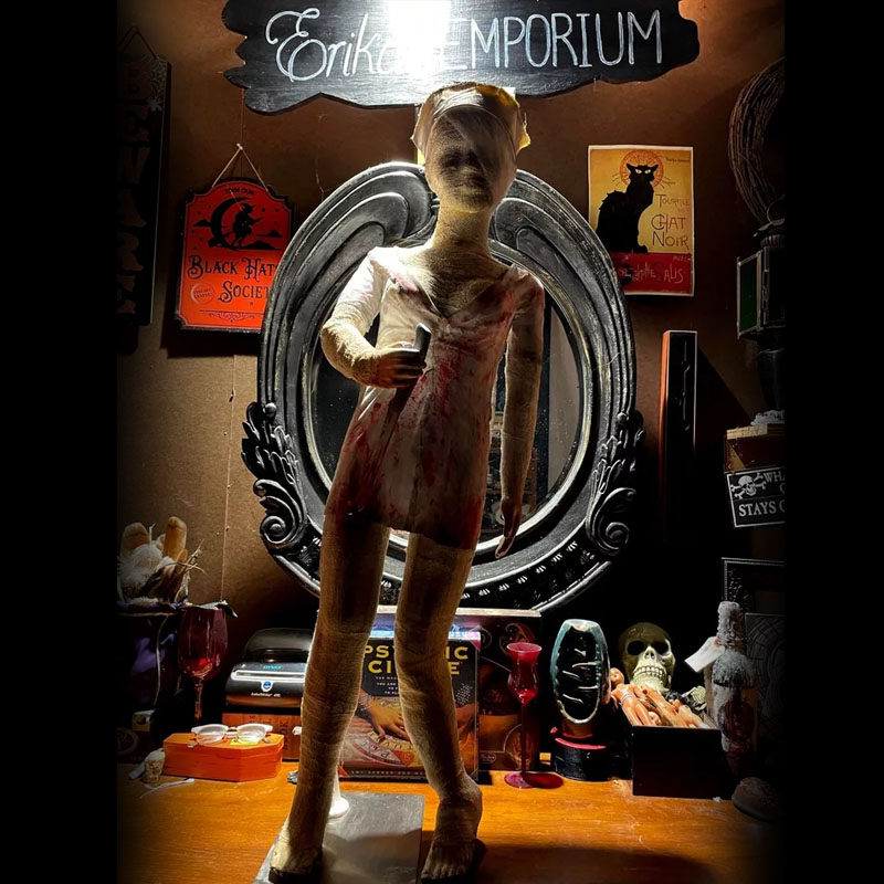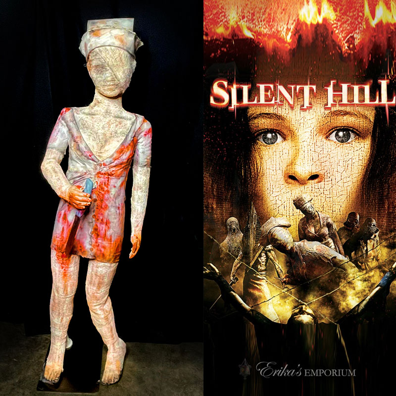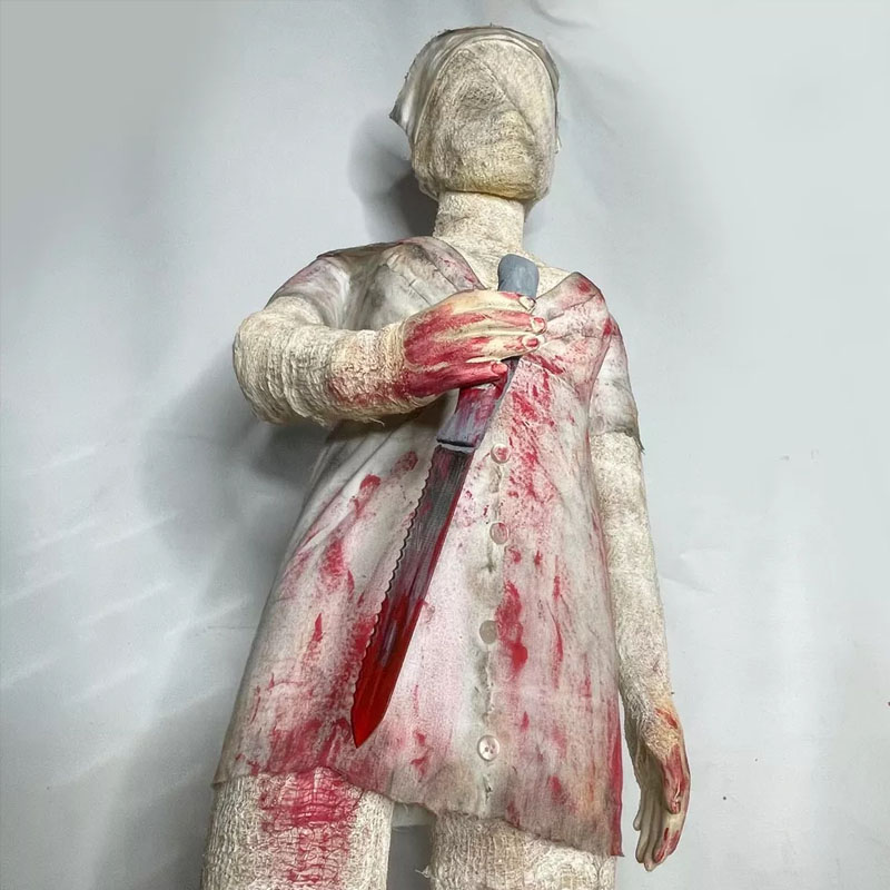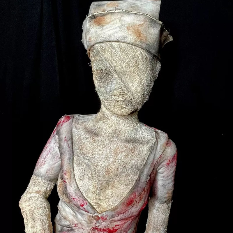 This unique, one-of-a-kind handmade horror doll stands at a towering height of 46 inches. Inspired by the eerie nurses from the Silent Hill franchise, this doll is a must-have collectible for any horror fan. Created by Erika's Emporium, this doll is sure to be a standout addition to your collection. Perfect for use as a prop for Halloween or any seasonal horror display.